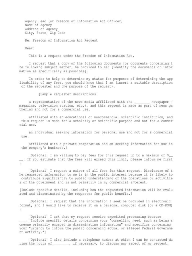 Sample Letters of FOIA Freedom of Information Act PDF Freedom Of