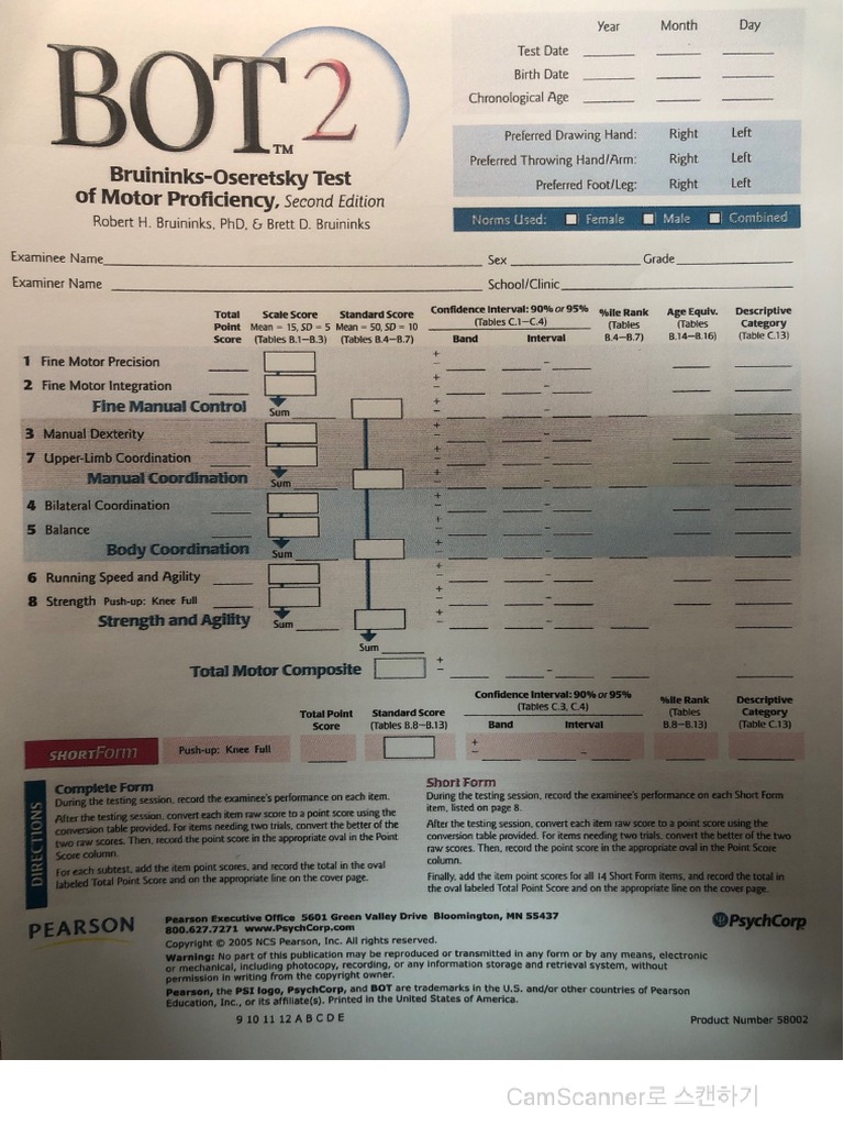 Administration instructions can be found in the test kit's administration easel. Short form for use as a screening tool for overall motor proficiency. The preferred administration option, as it has been found to be most reliable. Separate fine motor and gross motor kits available.