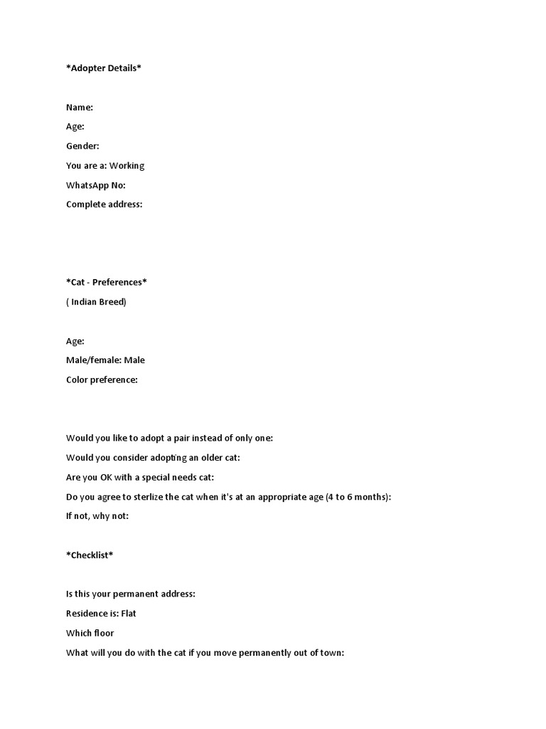 Cat Adoption Application Template Pdf