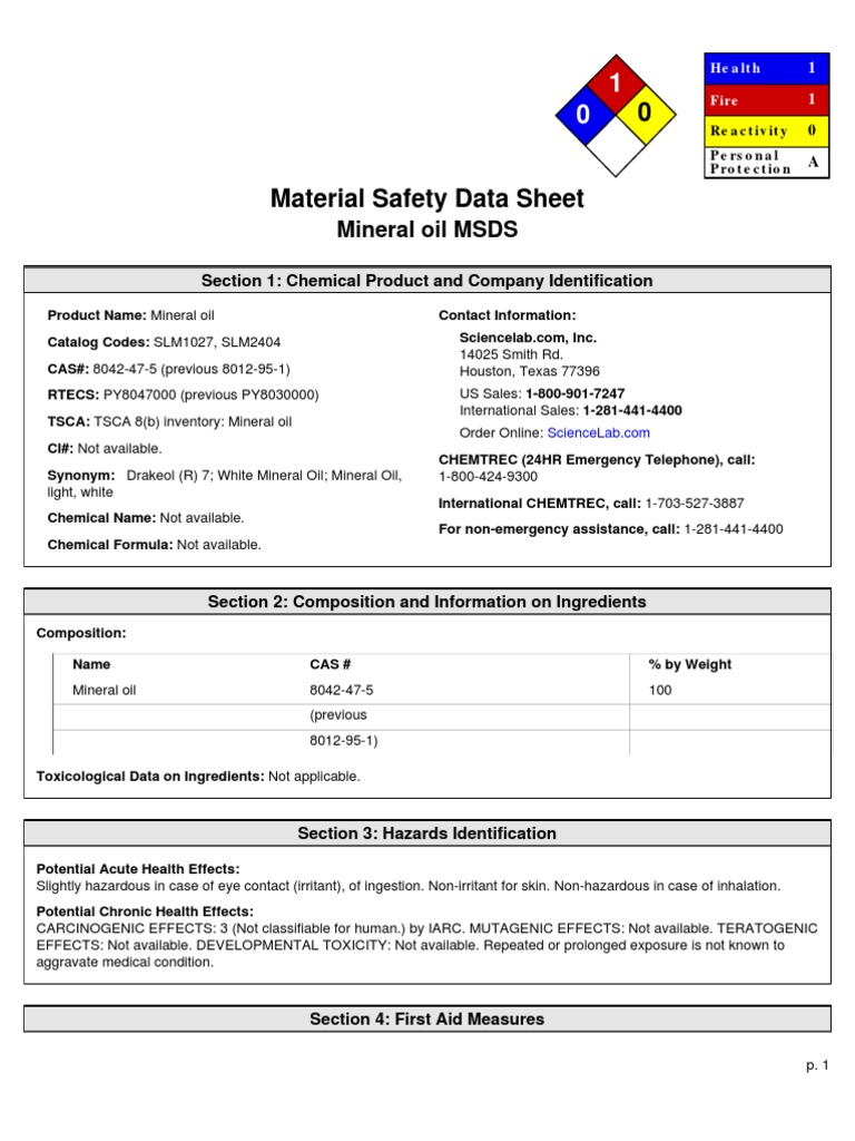 MSDS Mineral Oil Toxicity Flammability Prueba gratuita de 30 días