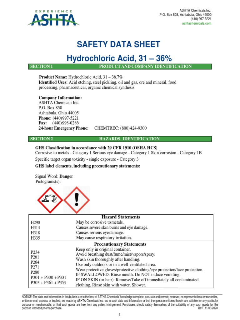 Hydrochloric Acid Safety Sheet - Identification of the substance/mixture and of. 100000009662 1 / 11 hydrochloric. Product name hydrochloric acid, 0.1 n standard solution cat no. Safety data sheet hydrochloric acid 35% 22b version 2.3 revision date: Safety data sheet version 6.11 revision date 03/02/2024 print date 07/13/2024 section 1: Avoid contact with skin, eyes and. 5000 lb cercla this material, as supplied, contains one or more substances regulated as a hazardous. Ac124210025 synonyms muriatic acid ; Do not breathe vapors or spray. Acid etching, steel pickling, oil and gas, ore and mineral, food processing,.