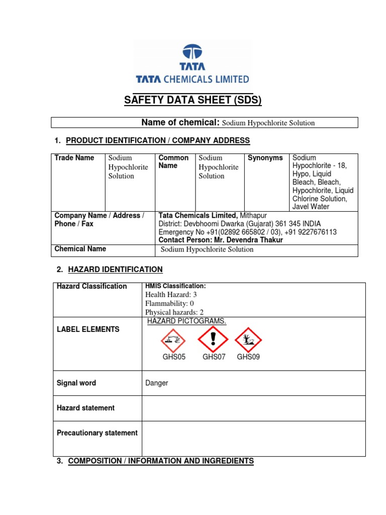 Safety data sheet sodium hypochlorite 12.5% version 1.18 revision date: Wash skin thoroughly after handling. Safety data sheet version 6.13 revision date 09/07/2024 print date 09/08/2024 section 1: Do not breathe dusts or mists. Identification of the substance/mixture and of the company/undertaking 1.1 product identifiers.